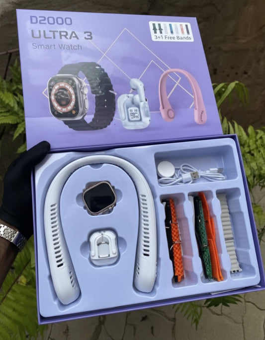 🌬️ D2000 ULTRA 3 Smart Watch & Neck Fan Combo – Stay Cool & Connected!